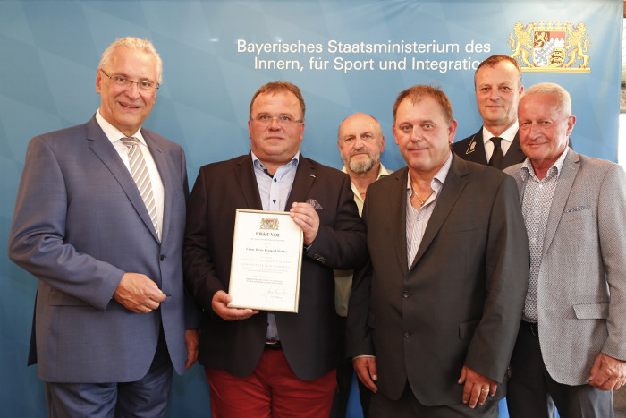 Kürzlich wurde der Dieter Kempa Etiketten GmbH eine nicht alltägliche Ehrung zu Teil. Die Firma wurde vom bayrischen Innenminister Joachim Herrmann ausgezeichnet als Ehrenamtsfreundlicher Betrieb – Gemeinsam für mehr Sicherheit. Die Ehrung fand in Kehlheim statt, hierzu waren die beiden Geschäftsführer Ralf und Ulf Kempa eingeladen, begleitet wurden Sie vom 3. Bürgermeister der Marktgemeinde Feucht, Gerd Steuer, dem stellvertretenden Landrat des Landkreis Nürnberger Land, Norbert Reh, sowie dem örtlich zuständigen Kreisbrandrat, Norbert Thiel. Nachfolgend ein Auszug aus der Laudatio des bayerischen Innenministers: